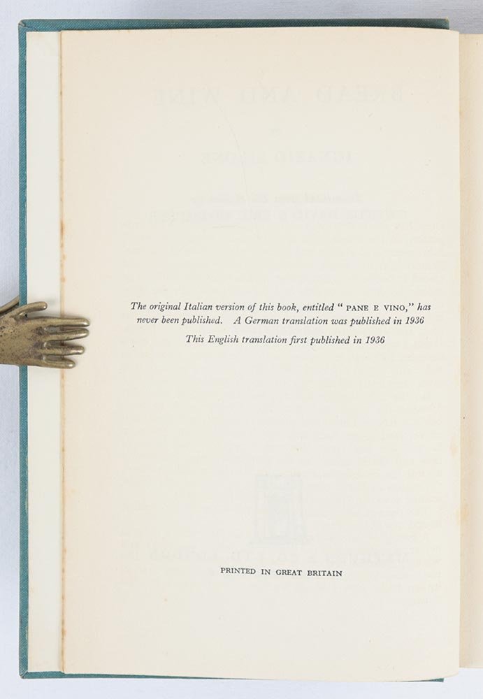 LIBROPrima edizione inglese.Ottimo esemplare (dorso leggermente angolato e scolorito).Contrariamente a quel che si potrebbe pensare, la traduzione inglese di «Pane e vino» non avvenne tramite la mediazione tedesca di Emil Oprecht. Silone aveva un ottimo rapporto diretto con Methuen, il suo editore inglese, al quale indirizza lettere che a partire dal dicembre 1934 testimoniano l’andamento del romanzo; «ancora a Methuen, il 27 settembre 1935, invierà “una larga parte del manoscritto [.]. Il resto è già scritto, ma prima di farlo copiare devo attendere gli eventi delle prossime settimane”» (Falcetto, p. 1499). La traduzione avvenne dunque direttamente dall’italiano, come specificato nel sottotitolo. Sempre a Methuen, ma anche al traduttore Eric Mosbacher (che in copia con la moglie Gwenda David si occupò di tutti i libri dell’autore), Silone parlerà anche del seguito del romanzo, «Il seme sotto la neve», in lavorazione già dal settembre 1936 (Falcetto, p. 1523). In seguito a profondi cambiamenti interni alla direzione, in realtà, dal 1937 Methuen non sarà più l’editore di Silone, le cui opere usciranno invece da Jonathan Cape.D’Eramo, Ignazio Silone (Roma 2014), p. 144; Falcetto (cur.), Silone: Romanzi e saggi 1927-1944 (I Meridiani), pp. 1499-1501