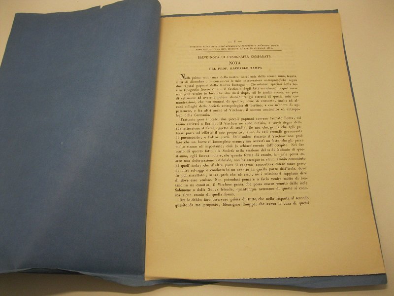 In 4. Pp. 4. Br. muta.Estratto dagli Atti dell'Accademia Pontificia dei Nuovi Lincei - Anno XLV - Tomo XLV, Sessione I.a del 20 dicembre 1891. In questa relazione lo Zampa esamina un bambino proveniente dal Sudan e confronta le sue caratteristiche psico fisiche con quelle di due ragazzi della Papuasia ai quali aveva gia' dedicato precedentemente un saggio etnografico.