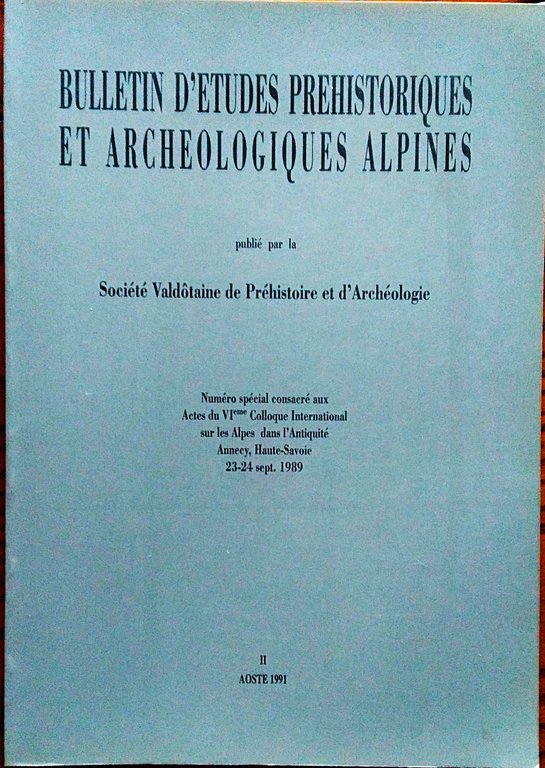 Bulletin d'Etudes Prehistoriques et Archeologiques Alpines publié par la Société Valdotaine de Préhistorie et d'Archéologie. Numero spécial consacré aux Actes du VIe Colloque sur les Alpes dans l'Antiquité. Annecy, Haute-Savoie, 23 - 24 sept. 1989.