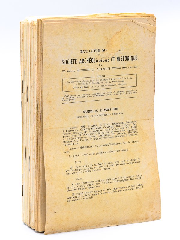 Bulletin de la Société Archéologique et Historique de la Charente. [ Lot de 180 numéros Années 1948 - 1969 ] Année 1948 : 7 numéros sur 9 - 1949 : 9 numéros, complet - 1950 : 9 numéros, complet - 1951 : 9 numéros, complet - 1952 : 9 numéros, complet - 1953 : 9 numéros, complet - 1954 : 9 numéros, complet - 1955 : 9 numéros, complet - 1956 : 9 numéros, complet - 1957 : 9 numéros, complet - 1958 : 9 numéros, complet - 1959 : 9 numéros, complet - 1960 : 9 numéros, complet - 1961 : 9 numéros, complet - 1962 : 8 numéros sur 9 - 1963 : 9 numéros, complet - 1964 : 9 numéros, complet - 1965 : 9 numéros, complet - 1966 : 9 numéros, complet - 1967 : 9 numéros, complet - 1968 : 5 numéros sur 9 - 1969 : 7 numéros sur 9