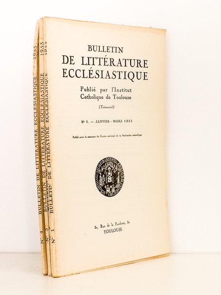 4 fasc. in-8 br., Bulletin de Littérature Ecclésiastique, Institut Catholique de Toulouse, Toulouse, 1955 , 256 pp. Bon état. Non coupé. Prix pour l'ensemble. Peu courant.