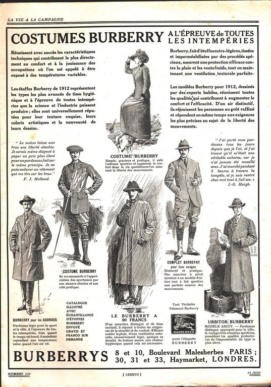Burberrys. Al'epreuve de toutes le intemperies. Advertising 1912