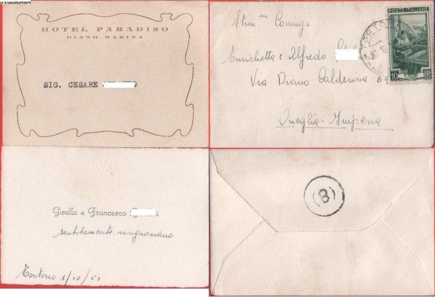 Busta affrancata 1952. Con biglietto intestato Hotel Paradiso. Diano Marina (IM)