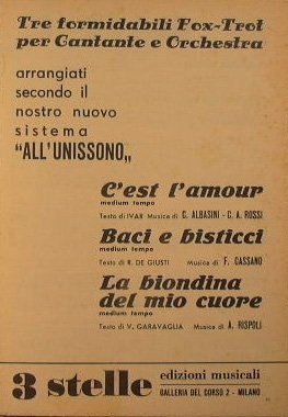 Autori: Albasini C., Rossi C. A., Cassano F., Garavaglia V. e Rispoli A. - Tre fox trot per Cantante e Orchestra arrangianti secondo il sistema ' All'Unissono ' - in 8° - pp.21 - Brossura editoriale - Partitura per Pianoforte, Violino/Fisarmonica/Chitarra/Vibrafono, Strumenti in Si b e Strumenti in Mi b