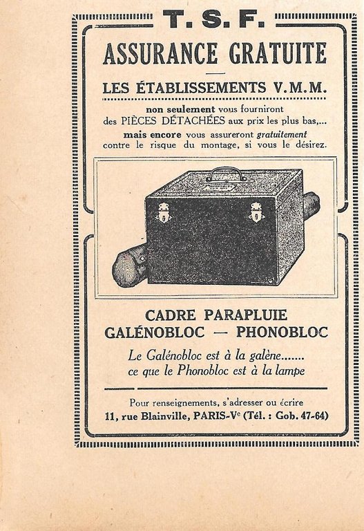 Cadre parafluie, galenobloc, Phonobloc. Etb. VMM. Pubblicita 1923