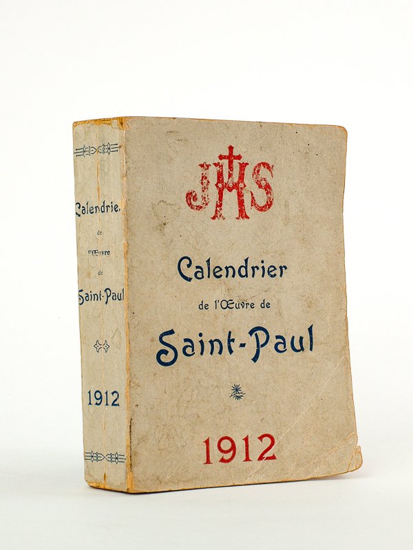 1 vol. petit in-12 br., Librairie Saint-Paul, Paris, 1912, env. 400 pp. au total (non paginé) Etat satisfaisant (couv. frottée, bon état par ailleurs). Calendrier peu courant pour une année aussi ancienne. L'Oeuvre de Saint-Paul (Congrégation des Soeurs de Saint-Paul de Fribourg) est une congrégation missionnaire d'origine suisse, fondée en 1873 par le chanoine Schorderet. De nos jours encore, elles continuent de publier un calendrier annuel.