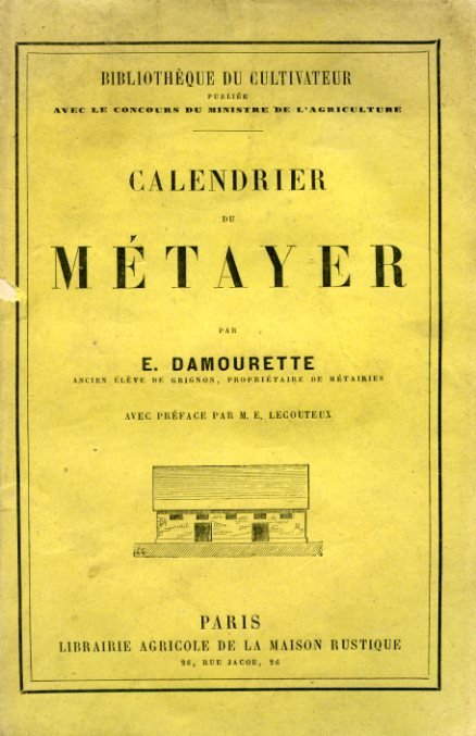 In-16°, pp. 176, 36 di catalogo editoriale aggiornato al gennaio 1869, brossura editoriale gialla con titolo e piccola vignetta entro filetti. Dorso restaurato, ma buon esemplare a fogli chiusi. Prima edizione di questo calendario-manuale del mezzadro per tutti i mesi dell'anno. Bibliothèque du Cultivateur publiée avec le concours du Ministre de l'Agriculture.