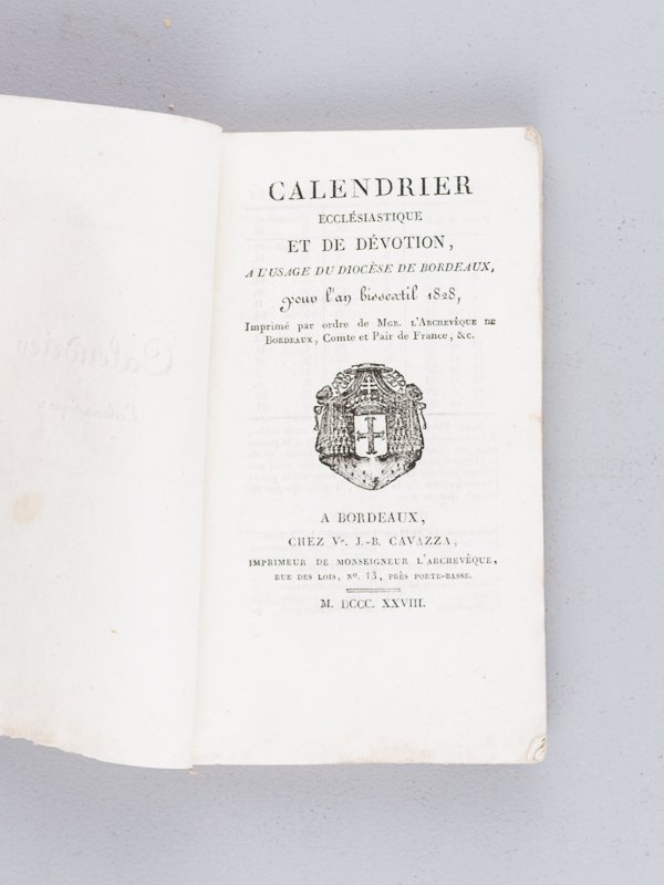 1 vol. in-18 br., Chez Ve J.-B. Cavazza, Bordeaux, 1828, 126 pp. Etat satisfaisant (mq. en couv. d'attente, une piq. de vers marginale n'affectant pas le texte) pour ce calendrier qui est un véritable annuaire du diocèse de Bordeaux, avec la liste complète de tous les ecclésiastiques, par paroisse.