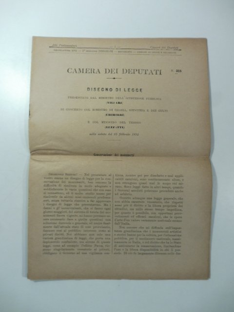 In 8 (cm 21 x 28), pp. 11 + (1b). Privo di legatura all'origine. Piega nel mezzo. Piccolo strappetto all'ultimo foglio. Disegno di legge relativo alla conservazione dei monumenti. Fa parte della raccolta degli Atti parlamentari.