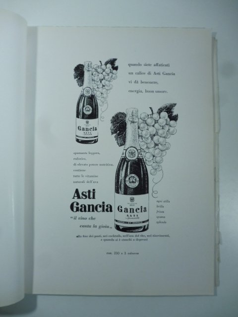 In 4 (cm 24,5 x 33,5 circa), pp. 60 con tavole doppie e ripiegate. Brossura editoriale. Catalogo delle pubblicita' Gancia relative all'Asti e alla Riserva uscite sui principali giornali fra ottobre e novembre 1954.