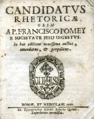 In-24° (115x89mm), pp. (8), 238, cartonatura alla rustica coeva con dorso rivestito in carta antica adorno di titolo calligrafato al tempo. Emblema xilografico della Compagnia di Gesù al titolo. Fioriture e bruniture sparse. Riedizione del primo Settecento di questo popolarissimo manuale di retorica largamente impiegato nelle scuole gesuite nel XVII e nel XVIII secolo. L'opera apparve primamente nel 1659. Umanista francese nato a Pernes nel 1619, il Pomey entrò nella Compagnia di Gesu' nel 1636. Fu insegnante di letteratura e retorica in vari collegi per 18 anni e Prefetto degli Studi a Lione, città in cui mori' nel 1673. Compose numerose opere a carattere morale, retorico, grammaticale e lessicografico, tra cui: Methodica particularum orationis collectio (1655); Methodus ad omnes actiones rite obeundas (1655); Instruction chrestienne (1657); Hermes grammaticus (1657); Pantheum miticum seu fabulosa deorum historia (1659); Libitina seu de funeribus (1659); Pomarium latinitatis, seu phrases synonimae (1659); Lisle de paix (1660); Sillabus seu lexicum graeco-latino - gallicum (1664); Le dictionaire royal des langues francoise et latine (1664); Indiculus universalis (1667); Colloquia scholastica et moralia (1668).