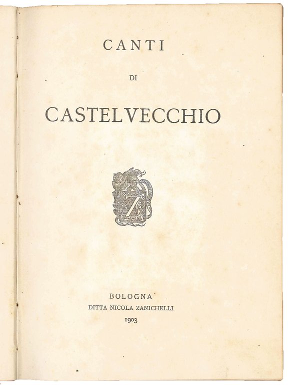 Prima edizione. I Canti di Castelvecchio sono una raccolta poetica pascoliana fitti di richiami autobiografici e di rappresentazioni della vita in campagna. L'epigrafe iniziale è la medesima di Myricae, dalla quarta bucolica di Virgilio: “Non omnes arbusta iuvant humilesque myricae” (Non a tutti piacciono gli arbusti e le umili tamerici). In tal modo, Pascoli recupera il legame con la raccolta precedente e la poetica del ‘fanciullino', accentuandone però la valenza simbolica.