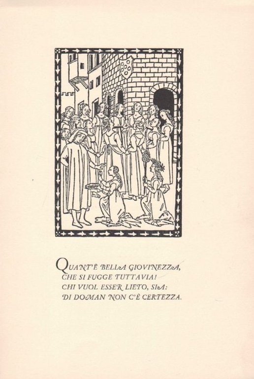 In-4° (cm 29 x 20), legatura in brossura rosa con titolo in nero al piatto, e pergamino protettivo; pp. non num. (12). A p. 5, prima dell'inizio del testo, grande vignetta in stile rinascimentale; alla fine, dopo il colophon, firma autografa dello stampatore. Bell'ex-libris applicato al contropiatto. Minuscolo strappetto (senza mancanze) al margine destro del piatto anteriore; comunque ottimo esemplare di questa bella plaquette.