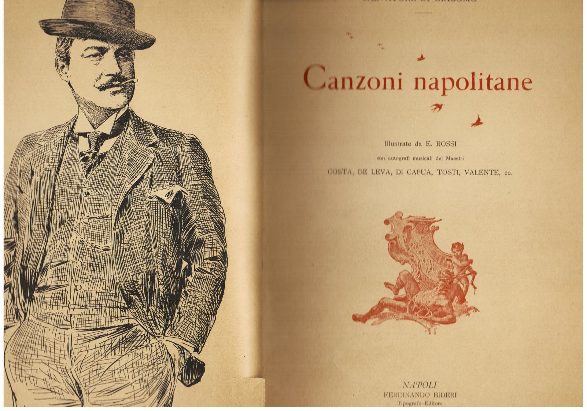 In-8°, pp. 164 nn., brossura marmorizzata posteriore. Antiporta con ritratto in b.n. del Di Giacomo, frontespizio in rosso e in nero con piccola vignetta in rosso. Numerose illustrazioni di E. Rossi intercalate n.t. e stralci di notazione musicale, egualmente n.t., da romanze dei principali autori di canzoni napoletane (Costa, De Leva, Di Capua, Tosti, Valente, etc.). Fregi tipografici impressi in rosso ed in nero. Brossura originale del piatto posteriore conservata all'interno. Tracce d'uso. Copia da studio. Raccolta elegantemente impressa delle canzoni napoletane del Di Giacomo (la prima edizione risale al 1891), uno dei massimi prodotti della poesia vernacolare partenopea e in assoluto della lirica italiana a cavallo tra Otto e Novecento. 'Si può dire di lui quel che fu detto del gran Lope de Vega, che come i fanciulli di ogni oggetto che capita loro tra mano si fanno un giocattolo, così egli di qualsiasi incidente foggia subito una poesia.Un artista che mi è caro per la schiettezza del suo temperamento e per l'intensità e sobrietà della sua arte' (Benedetto Croce, La letteratura della nuova Italia). Cfr. Schlitzer, 396 bis.