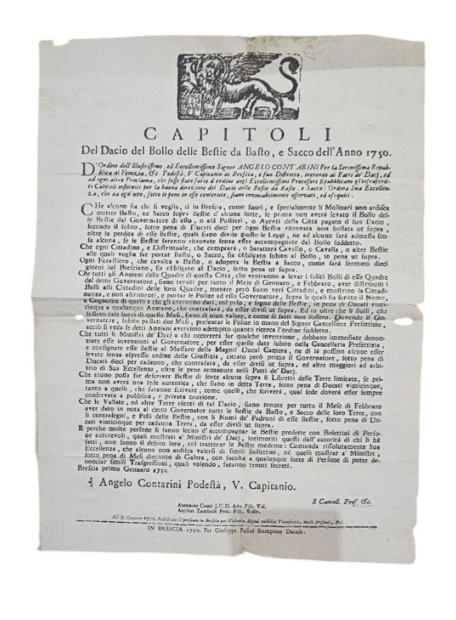 Capitoli Del Dacio Del Bollo Delle Bestie Da Basto E Sacco 1750 Brescia Contarini