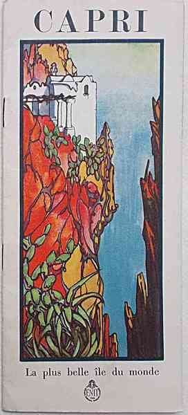 In 8° stretto (cm. 23 x 10); pagg. 24; numerose illustraz. fotograf. ben stampate in rotocalco e una cartina doppia; bella leggera cartonatura originale figurata a colori. VG. ** In francese. Il testo e le immagini propongono un itinerario di sette giorni a Capri.
