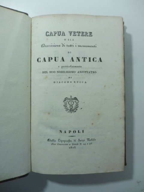 In 16 (cm 13 x 20), pp. (2) + XI + (1b) + 335 + (1b) + 2 fogli finali (4 pp.) con errore di numerazione delle pagine 137-138-139-140. Due tavole finali incise all'acquaforte piu' volte ripiegate disegnate da Gaetano Romano e incise da Gennaro Aloja raffiguranti un ordine di arcate dell'Anfiteatro e un'iscrizione e la pianta dell'Anfiteatro. Legatura coeva in mezza pelle con danno riparato al piatto anteriore. Fioriture alle pagine. Edizione originale, poco comune, di quest'opera storica su Capua Vetere. Lozzi I, 1o66; Cat. Lubrano, n.505; Borroni Il Cicognara, n.4753; Artigliere, n.841.