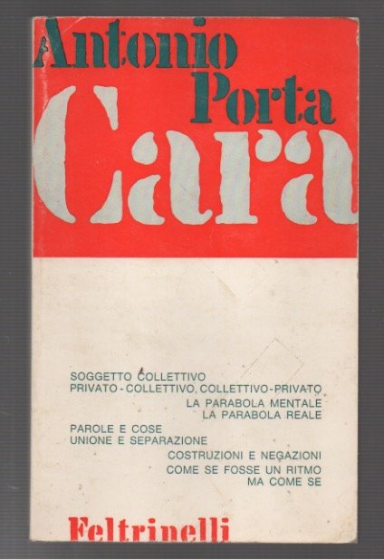 LIBROPrima edizione.Ottimo esemplare.Pubblicata da Feltrinelli nel marzo 1969 questa silloge raccoglie poesie del periodo 1965 - 1968 suddivise in quattro sezioni: 1965 - 1966; 1966 - 1967; 1967; e 1967 - 1968. Come riportato nelle note introduttive, per «Cara» (in particolare per la seconda parte) vale ciò che Fausto Curi aveva scritto sul numero 29 di «Il Verri» a proposito dell’evoluzione della scrittura di Antonio Porta: «Porta ha ora scelto un modo di impaginazione testuale e di strutturazione strofica che mobilizza al massimo ogni elemento compositivo e scioglie e alleggerisce quella sorta di sorpresa e coagulata drammaticità che era presente in molte sue poesie. In alcuni casi si direbbe che la sua operazione consista nell’elaborare variazioni semantiche su un tema ritmico; o, per essere più precisi, nello stabilire una tensione fra lo spessore ritmico, che tende a consistere nella sua acuminata compattezza, e le strutture e i ritmi, che con la loro mobilità lo assottigliano e lo fluidificano. Ogni poesia è una compagine strofica più che un testo, una mobile struttura materiale, voglio dire, piuttosto che un sistema di significati».