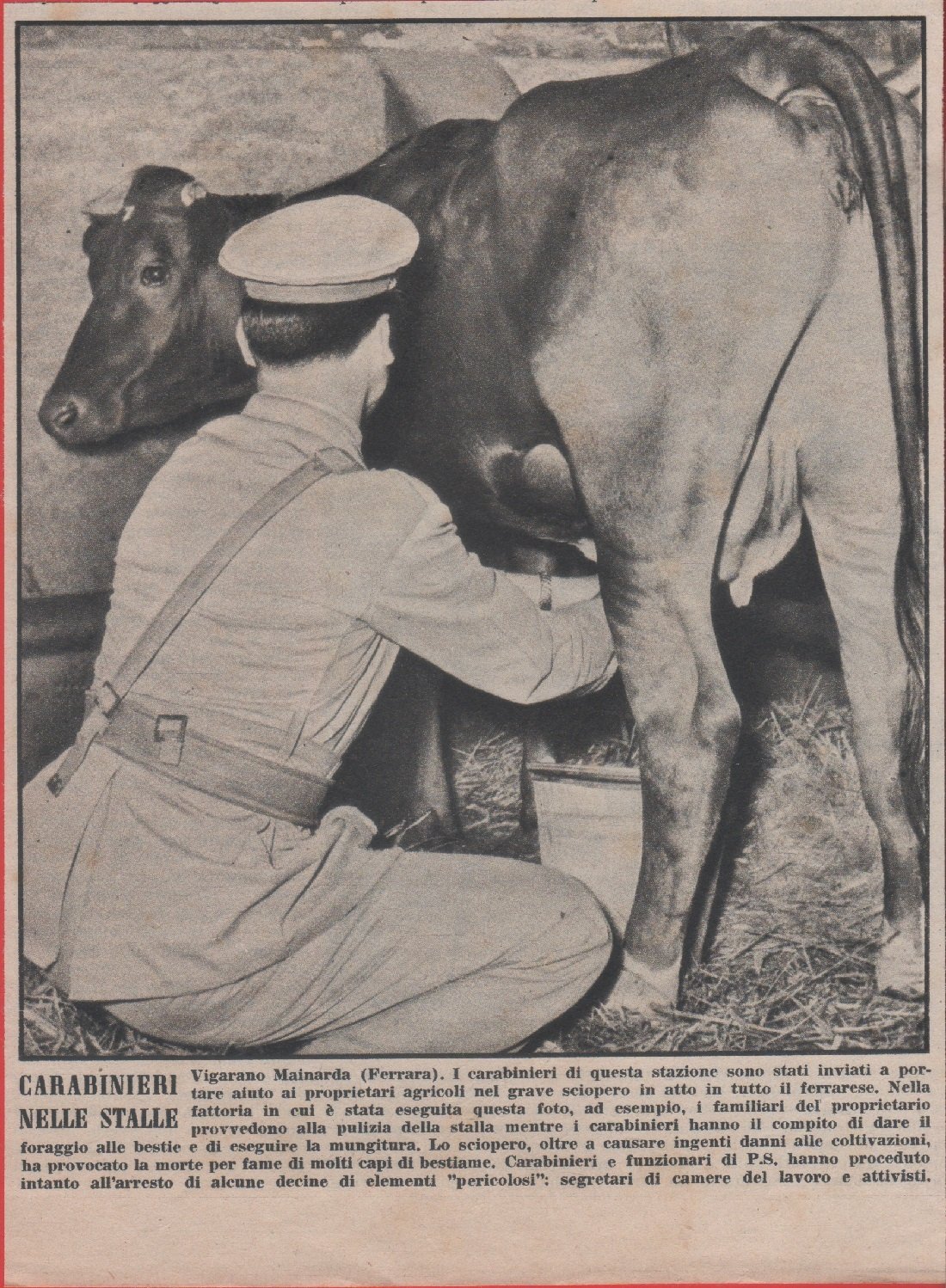 Carabinieri nella stalle a Vigarano Mainarda (FE) per lo sciopero. Advertising 1954