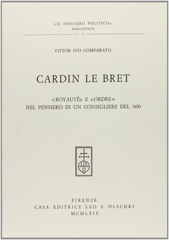 Comparato, Vittor I. Cardin Le Bret, «royauté» e «ordre» nel pensiero di un consigliere del Seicento. , Olschki 1969, 212 tracce d'uso al dorso (65127)
