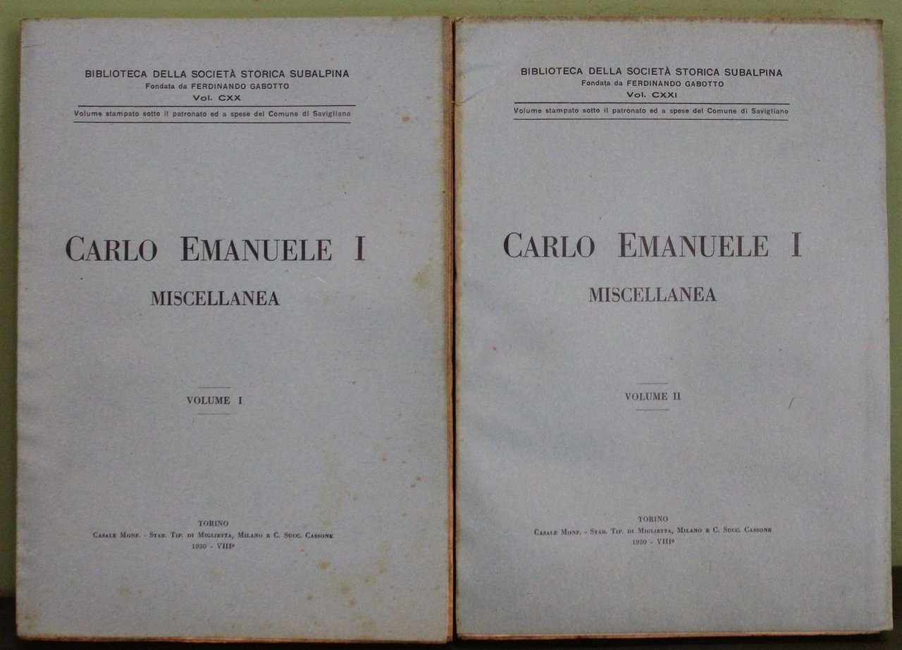 Due volumi in 8°, pp. (8), 430; (8); 454, (2). Brossura editoriale. Qualche minimo segno del tempo. Copia in buono stato, interamente a fogli chiusi. Biblioteca della Società Storica Subalpina, CXX - CXXI. Vol. I: Romolo Quazza, La politica di Carlo Emanuele I durante la guerra dei trent'anni; Antonio Fossati, Elementi per uno studio del 'Corso' e dell 'Abbassamento' delle monete d'oro sotto Carlo Emanuele I (1580-1630); Luigi Berra, I primordi del Santuario di Mondovi e Carlo Emanuele I (1595-1600); Eugenio Passamonti, Le 'Instruttioni' di Carlo Emanuele I agli Inviati Sabaudi in Roma con lettere e brevi al Duca dei Pontefici suoi contemporanei. Vol. 2: Italo Mario Sacco, Professioni, Arti e Commerci nelle Costituzioni di Carlo Emanuele I per il Piemonte e per il Porto di Nizza; Stanislao Cordero di Pamparato, I musici alla Corte di Carlo Emanuele I di Savoia; Mario Chiaudano, I lettori dell'Universita di Torino ai tempi di Carlo Emanuele (1580-1630); Jolanda Bachi, Il carteggio di Carlo Emanuele I negli ultimi due anni del suo governo.