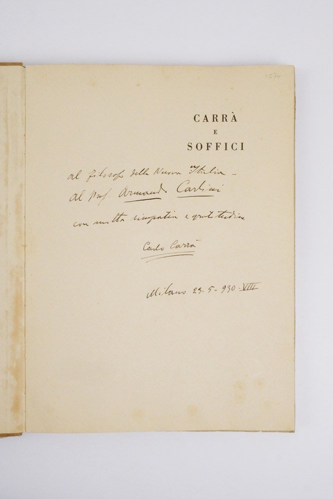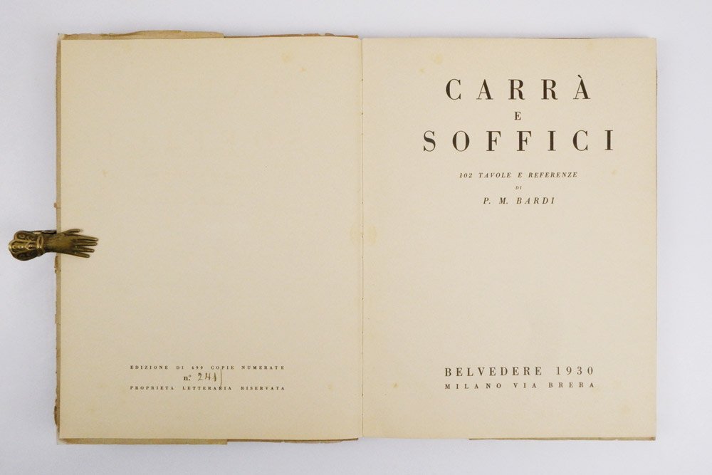 LIBROEdizione originale, tiratura numerata con copertina rigida.CON AUTOGRAFO.Esemplare numero 241 di 499 numerati a mano, completo della rarissima sovracoperta. Copia pregiata da bella dedica autografa di Carlo Carrà all’antiporta al filosofo e deputato del Regno d’Italia Armando Carlini: «Al filosofo della Nuova Italia - Al Prof. Armando Carlini con molta simpatia e gratitudine -- Carlo Carrà -- Milano 29 - 5 - 930 - VIII». Al tempo della dedica, Carlini era rettore dell’Università di Pisa. In ultimo passaggio, l’esemplare proviene dalla collezione futurista di Sergio Cereda, come da numero di archiviazione all’angolo alto della prima carta. Ottimo esemplare, fresco e pulito (occasionali piccoli punti di foxing internamente a qualche carta), ben conservato anche alla copertina, con localizzati restauri ai bordi della sovracoperta, a sanare qualche lacuna.Il libro fu stampato in due tirature: quella comune, con copertina morbida che riprende la grafica qui in sovracoperta, in sole 40 pagine; la tiratura di lusso su carta di pregio in 499 esemplari numerati a mano, rilegati con sovracoperta, che conta oltre al testo una fotografia di «Carrà e Soffici a Forte dei Marmi, 1929», applicata a p. 47, e soprattutto 96 tavole su carta patinata, equamente divise tra i due artisti, con la prima della serie stampata a colori (rispettivamente «Pescatori» e «Ragazzi»). -- Il 25 gennaio 1930 il giornalista e critico d’arte Pietro Maria Bardi inaugurò, presso la sua Galleria milanese situata in via Brera 31, una mostra dedicata a Carlo Carrà e Ardengo Soffici destinata a riscuotere un grande successo di pubblico e critica. L’operazione – insieme artistica e commerciale – si inquadrava in un piano generale di rilancio della sua attività di gallerista, dopo le alterne fortune che avevano accompagnato l’inizio di quell’esperienza nel 1928 con l’apertura della prima Galleria Bardi sempre in via Brera, ma al numero 16. L’allestimento seguì quello, altrettanto importante per la vocazione anche novecentista e moderna che lo spazio espositivo intendeva comunicare, del novembre 1929 dedicato al gruppo noto come «I sei di Torino», ovvero i pittori Jessie Boswell, Luigi Chessa, Nicola Galante, Carlo Levi, Francesco Menzio ed Enrico Paulucci. Commerciante d’arte e scrittore, Bardi affiancò allo spazio espositivo due pubblicazioni: il «Bollettino d’Arte» e la rivista «Belvedere», attiva anche come casa editrice della Galleria. E proprio per le Edizioni Belvedere uscì, nel gennaio 1930, questo volume dedicato a Carrà e Soffici, che ripropone con completezza la carriera artistica dei due, dal futurismo a Novecento, passando per la metafisica (Carrà), e dall’impressionismo a Novecento passando per il futurismo (Soffici).