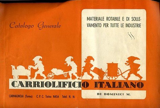 In-4° oblungo piccolo, pp. 40 nn., brossura editoriale illustrata a più colori con simpatiche figure di gnomi che trasportano carriole e carrucole. Interamente illustrato fotograficamente con riproduzione delle carriole commercializzate dalla ditta. Bell'esemplare. Raro catalogo commerciale della ditta carmagnolese stampato in piena Seconda Guerra Mondiale. Acclusa una lettera dattiloscritta (con firma autografa a matita del direttore della ditta) su carta intestata del Carriolificio Italiano datata Carmagnola, 23 agosto 1948, con invio del presente catalogo a un cliente della ditta.