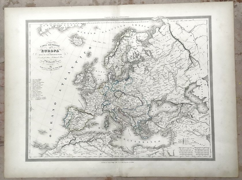 Carta geografica incisa con confini acquerellati, dim. parte incisa L. 46,5 x 36 cm. (l'intero foglio con margini L. 57 x 43 cm.). Leggerissime bruniture marginali ma nel complesso in buone condizioni.