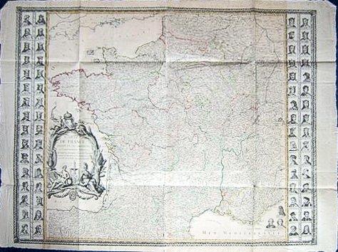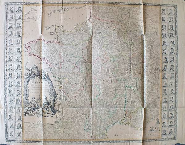 1 très grande carte dépliante au format 132 x 100,5 cm (en 4 feuilles jointes), frontières des provinces coloriées, portraits des rois de France gravés sur les marges verticales, Chez l'Auteur, Paris, 1776 Belle et très grande carte de France, imprimée en 4 feuilles réunies et rehaussées en couleurs à l'époque (infime fente en pliure centrale, fente avec très petit accroc sans manque sur pliure en queue, petites piqûres d'aiguille en coins). Rare.