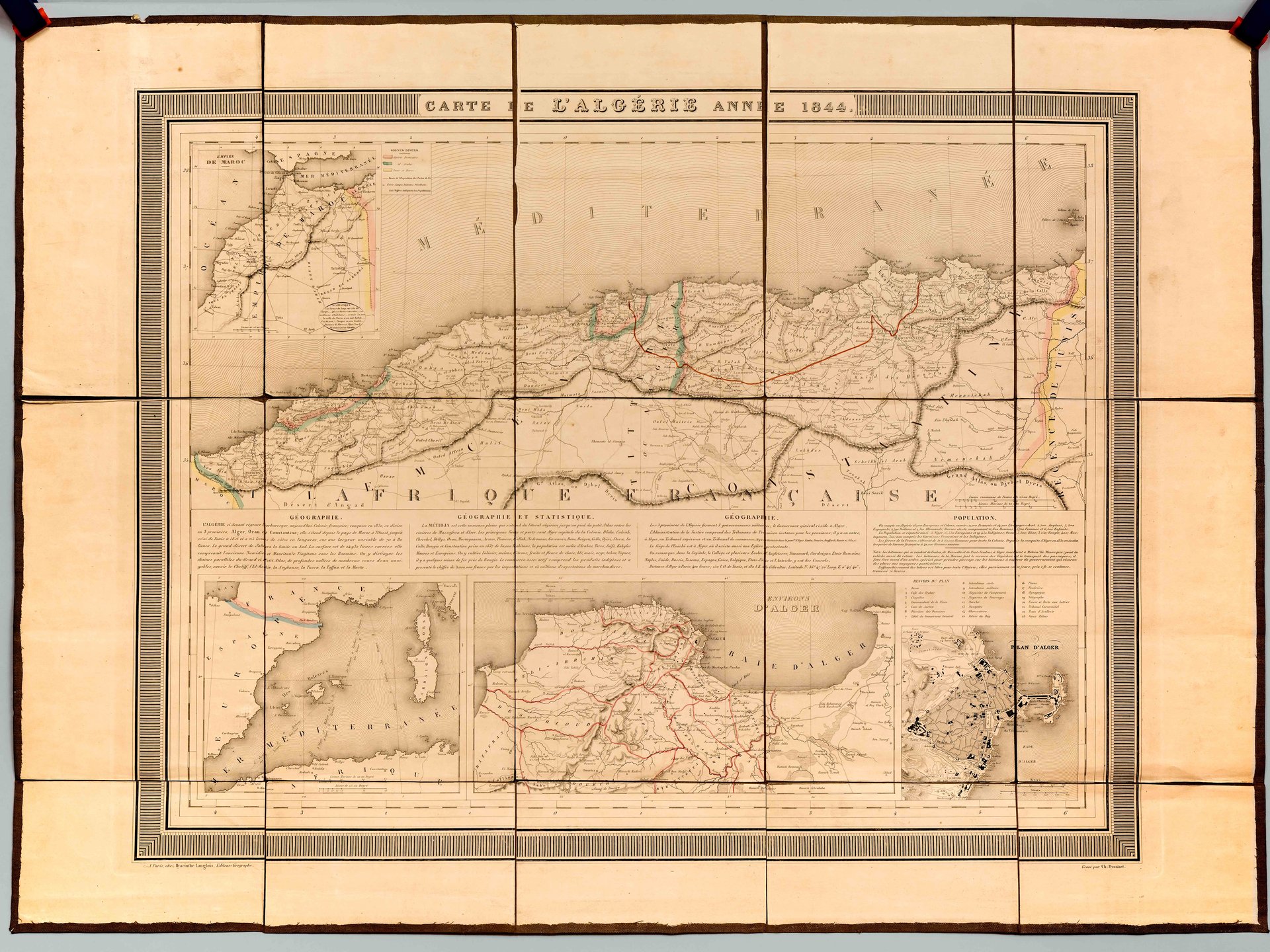 Carte dépliante entoilée format 79,5 x 58 cm, gravé par Dyonnet, Chez Hyacinthe Langlois, 4 rue du Pot de Feu St Sulpice, "Carte de France d'après Cassini", s.d. [ 1844 ] Jolie carte ancienne de l'Algérie rehaussée en couleurs. On y découvre en encart les "Environs d'Alger" ou "l'Empire de Maroc". Bon état (petit accroc en marge entoilée, petits frott.)