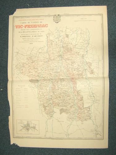 Carte du Canton dressée sous l'Administration de M. G. Delatte, préfet du Gers, par les soins et sous la direction de M. Phiquepal d'Arusmont, Ingénieur en chef des Ponts et Chaussées, revue, corrigée et mise à jour par l'Administration des Ponts et Chaussées, 1 carte en trois couleurs, 90.5 x 64 cm, gravée par Hausermann et A. Simon, Paris, Imp. Becquet, L. Chanche, Auch, 1881, échelle 1/40 000, avec le plan de la ville de Vic-Fezensac en cartouche Etat satisfaisant (pliure centrale habituelle, 2 manques angulaires n'affectant pas l'impression).
