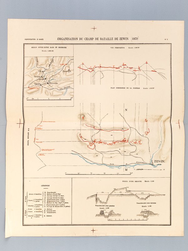 1 plan en couleurs au format 54 x 45 cm, plan n° 3 d'un cours de Fortification 2e année, s.d. (circa 1889) Bon état.