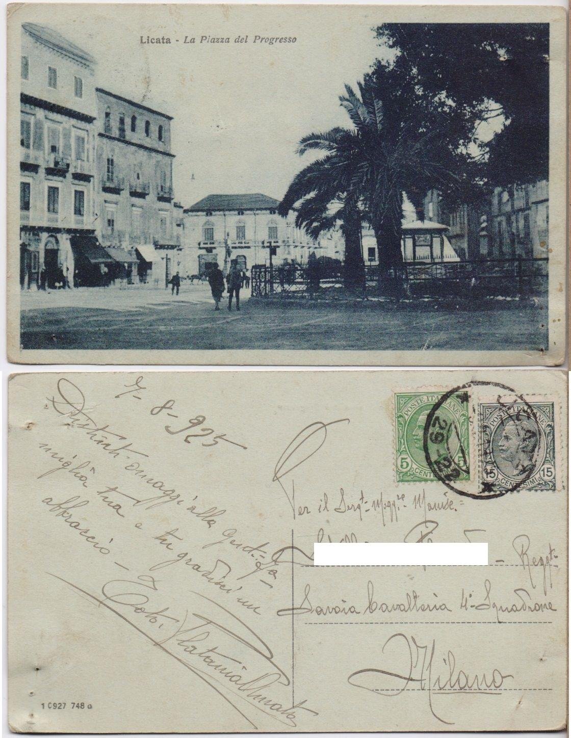Cartolina - Licata. La piazza del progresso. Viaggiata 1925, animata