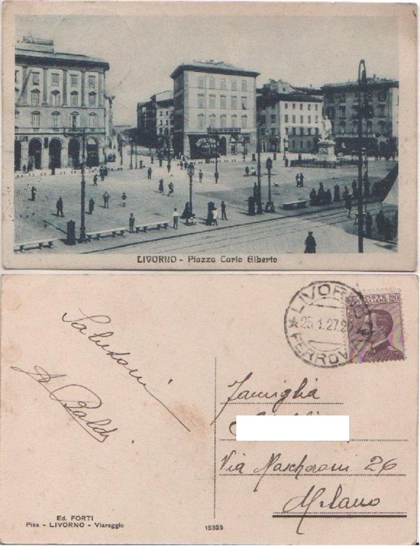 Cartolina - Livorno. Piazza Carlo Alberto - Viaggiata 1927. Animata