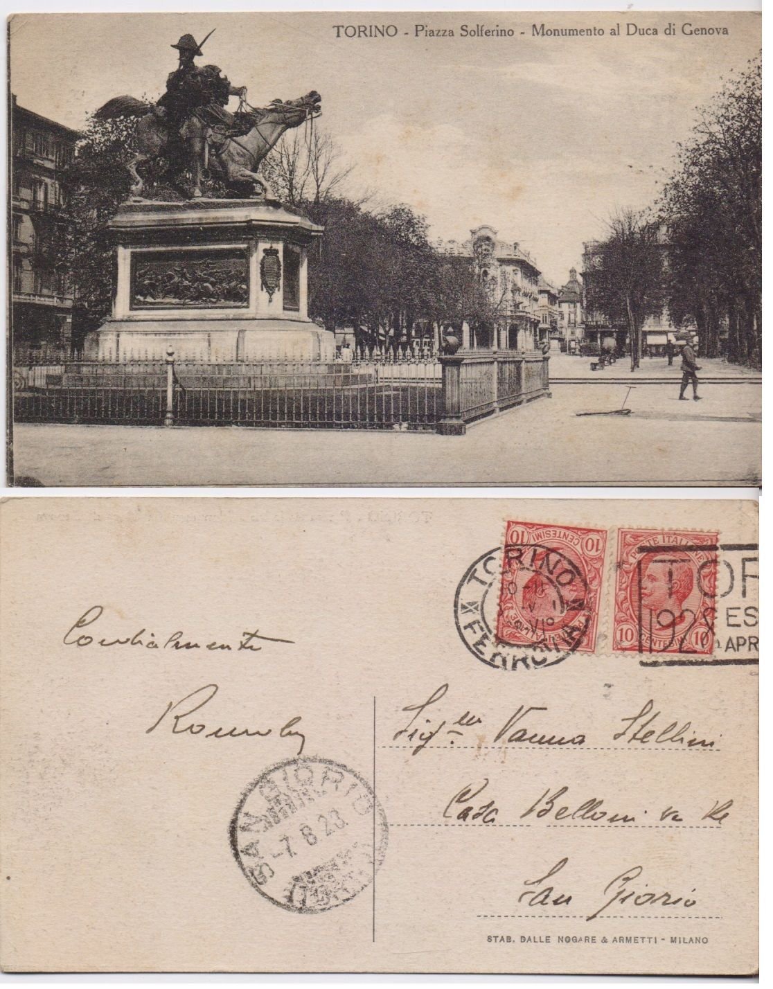 Cartolina - Torino. Piazza Solferino. Monumento al Duca di Genova. Viaggiata 1928