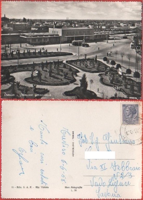 Cartolina - Treviso. Stazione ferroviaria. Viaggiata 1958, automezzi