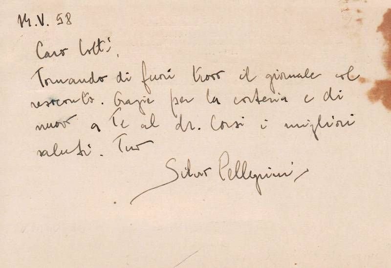 Cartolina intestata di 'Studi Mediolatini e Volgari', scritta al verso su 6 righe più firma autografa. Vi si ringrazia il destinatario per l'invio di un giornale. Silvio PELLEGRINI (1900 - 1972) è stato un linguista e filologo, docente all'Università di Pisa, e fondatore della rivista 'Studi Mediolatini e Volgari'.