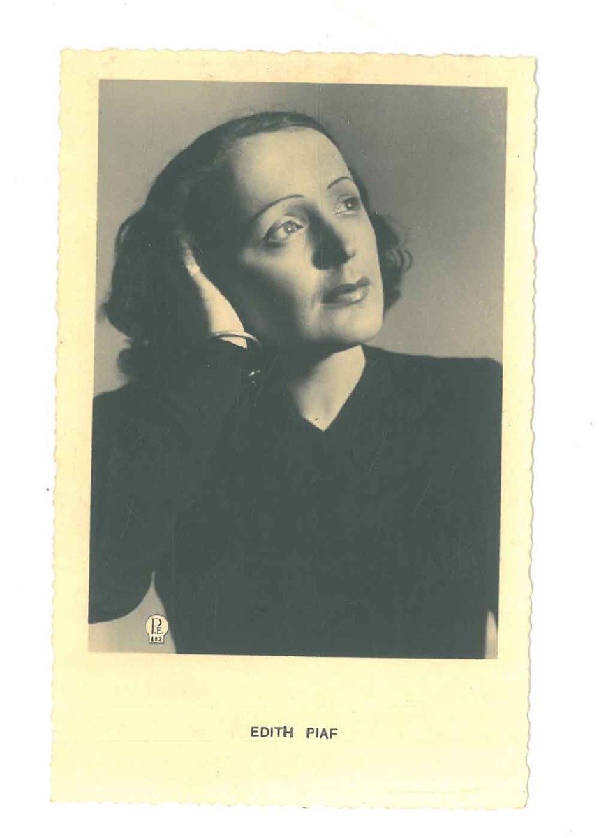 Cartolina con fotografia di Edith Piaf in primo piano