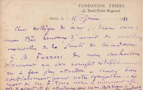 AUTOGRAFOBoutroux, allora direttore della Fondazione Thiers, scrive all’amico italiano ringraziandolo per avergli inviato sue notizie e della sua famiglia. Scrive anche del filosofo Felice Tocco e della sua morte, avvenuta a Firenze alcuni giorni prima.