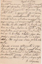 AUTOGRAFO Contenuto di carattere politico relativa all'attività parlamentare di Colajanni. “[.] non sono un convertito al monopolio. Il principio informatore l'ho sempre caldeggiato. Respingevo le modalità al primo progetto Nitti; lo approverò se verranno, come credo, emendamenti nel senso indicato nel mio articolo, compresa la conservazione e il rinnovamento delle mutue [.]”. Era infatti in atto in quell'anno un aspro dibattito parlamentare sulla soppressione delle mutue che vide duramente contrapposti i diversi schieramenti.