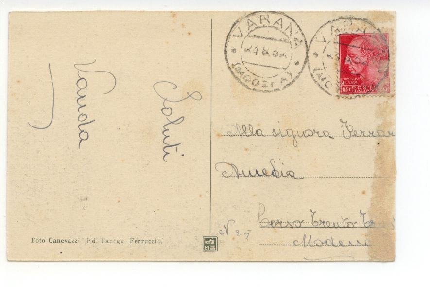 Cartolina originale, Varana Panorama Ed. Taneggi Ferruccio, 1934; cartolina originale fotog. in b/n.; figurata. Viaggiata. Cm 13x9. Condizioni di conservazione Cartolina ben conservata. CART.0940G