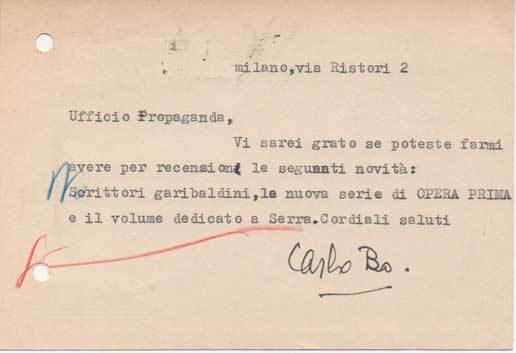 AUTOGRAFORichiesta di volumi per recensione: “[.] Scrittori garibaldini, la nuova serie di Opera prima e il volume dedicato a Serra”.