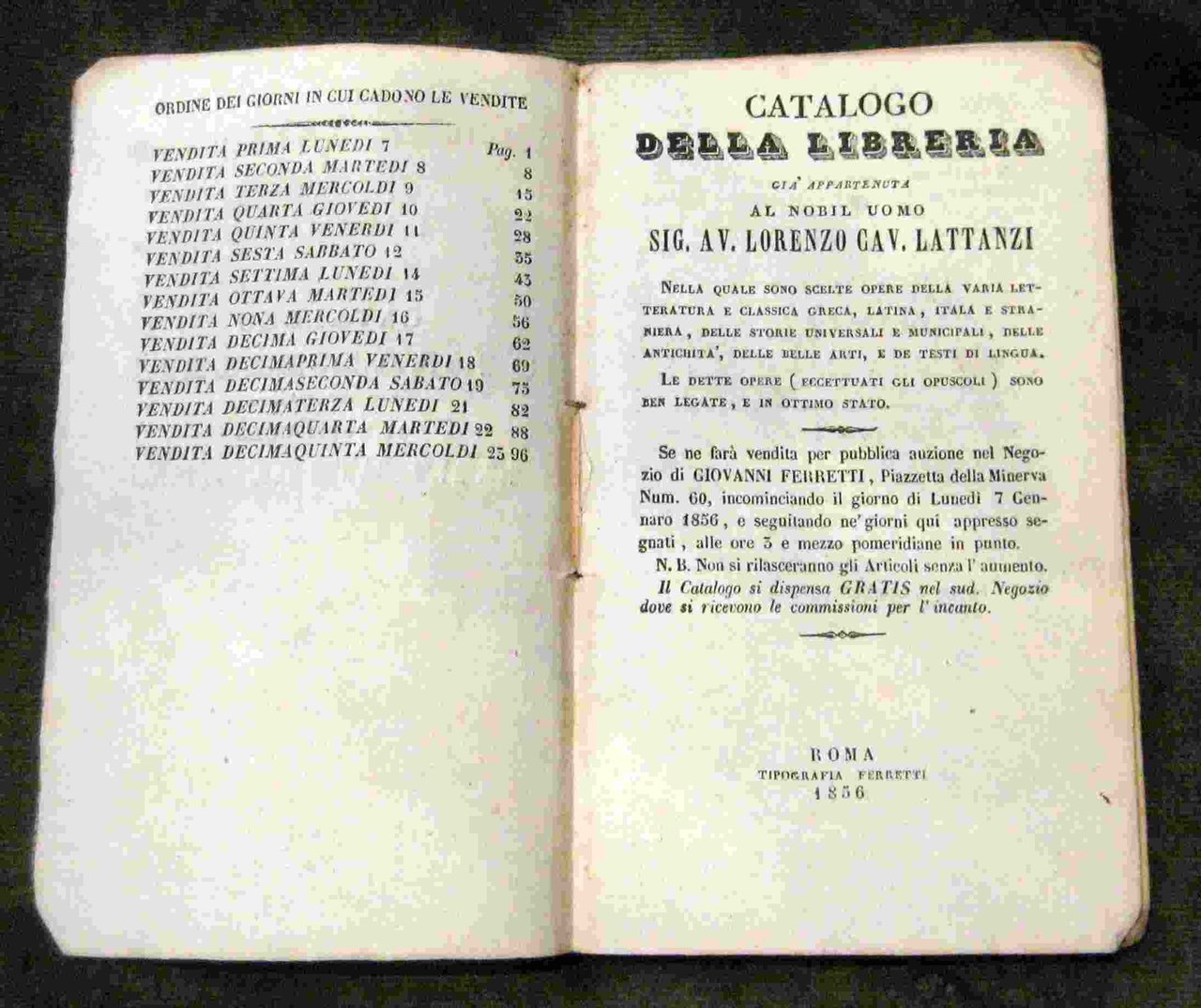 Catalogo della libreria già appartenuta al nobil uomo sig. av. Lorenzo Cav. Lattanzi. Se ne farà vendita per pubblica auzione nel Negozio di Giovanni Ferretti, Piazzetta della Minerva Num. 60.
