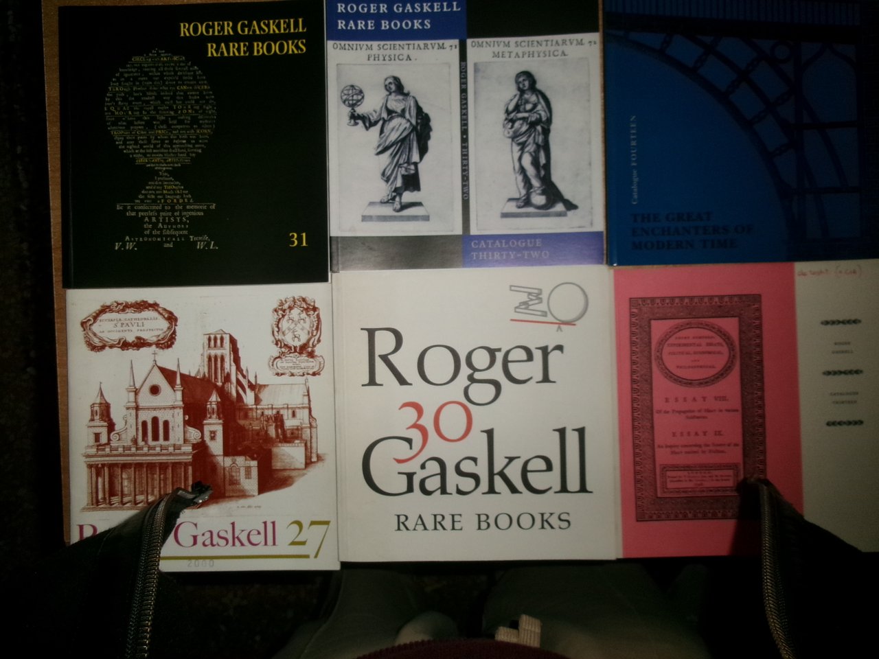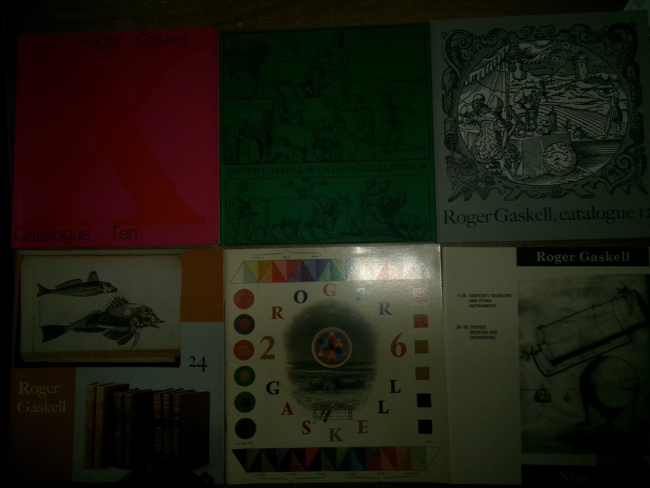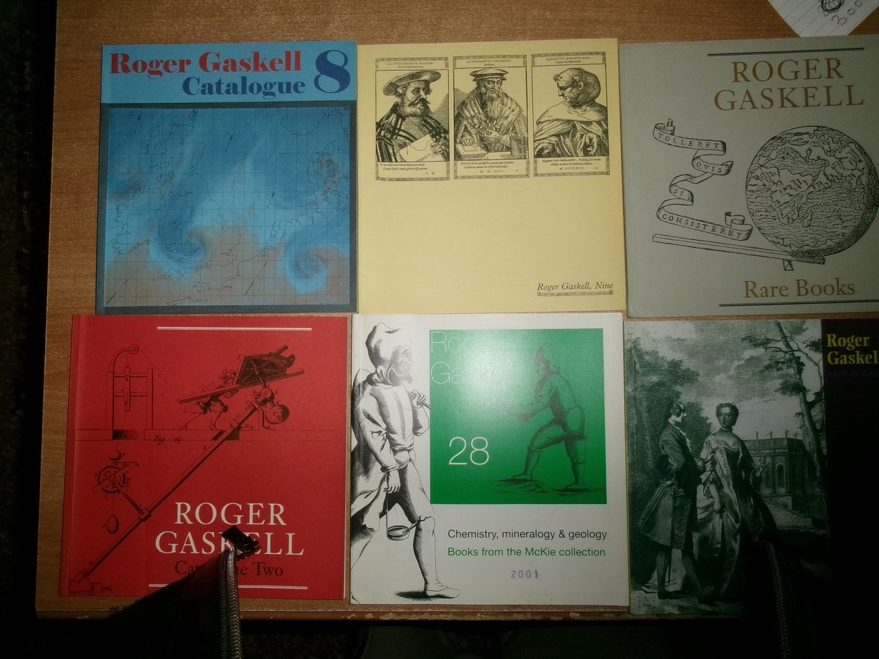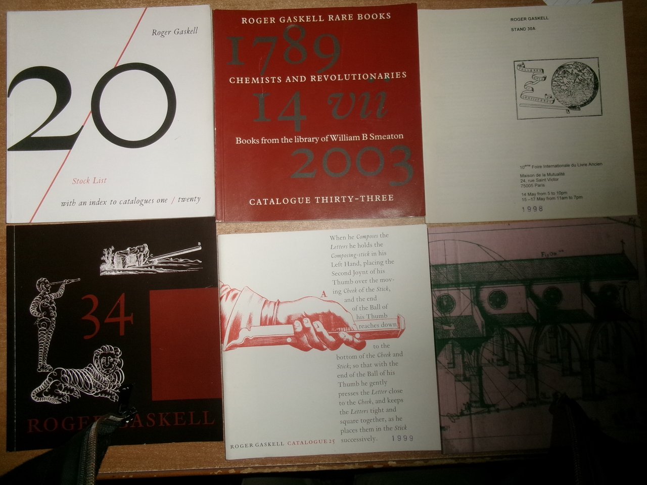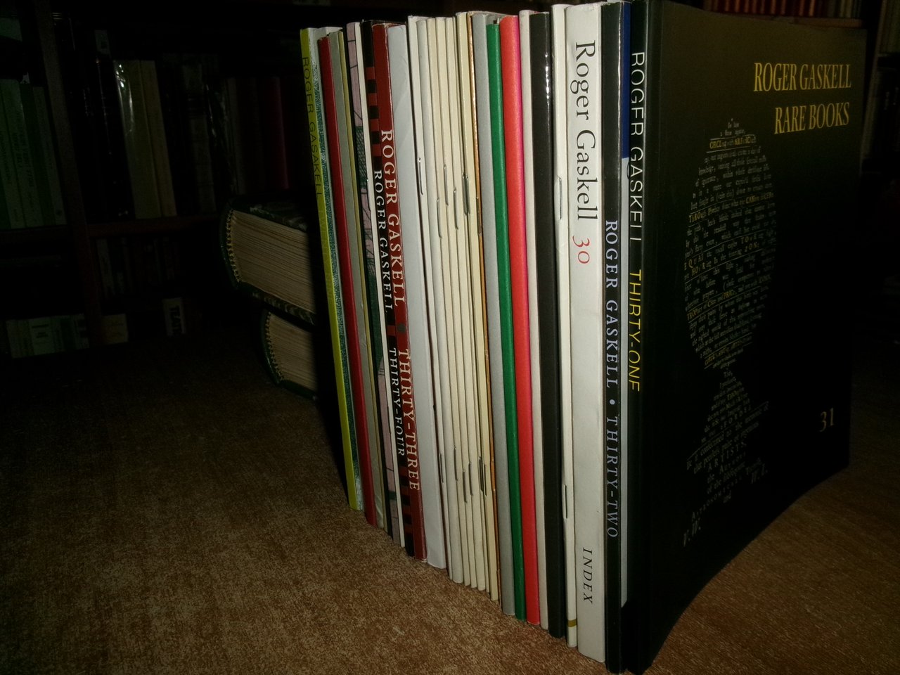 (Catalogue) 31 cataloghi di ROGER GASKELL. England, anni '90. In-8°, br. alcuni con punti metallici. Raccolta di 30 cataloghi con accurata descrizione di innumerevoli libri rari e antichi di una delle più famose librerie antiquarie del mondo. Sono in vendita i seguenti numeri: 11 - 24 - 26 - 10 - 27 - 30 - 31 - 32 - 13 - 14 - 15 - 22 - 16 - 12 - 18 - 23 - 17 - 2 - stand 30a - stand 38B - 33 - 21 - 20 - 25 - 34 - 8 - 29 - 1 - 9 - 28. Ottimo stato con testo in inglese e numerose riproduzioni/fac-simili n.t. con prezzi in sterline. Neg. magazz. in busta nera entro sport. di tela.