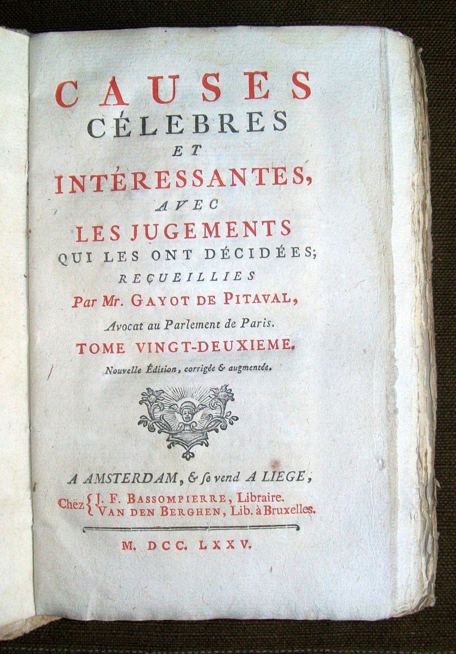 In -8 (cm. 17 x 10), pp. 530 (7). Cartonatura rustica dell’epoca con titoli calligrafati sul dorso. Tomo ventiduesimo della raccolta di cause celebri. Buon esemplare, a pieni margini. In questo tomo le ultime 130 pagine sono dedicate alla questione della cacciata dei Gesuiti, richiesta dall’Università di Parigi il 18 aprile 1594.