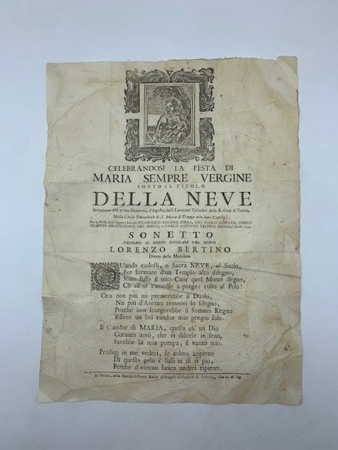 Manifesto cm 35 x 47, segni di stazzonatura al foglio. Stemma xilografico in testa raffigurante la Madonna della Neve. Manifesto pubblicato in occasione delle celebrazioni per la festa della Madonna della Neve solennizzata la prima domenica di agosto dell'anno 1739 nella Chiesa parrocchiale di S. Maria di Piazza a Torino da parte della Societa' dei calzolai della citta'.