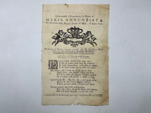 Manifesto cm 26,5 x 40, alcune pieghette al foglio e lieve mancanza al margine inferiore. Sonetto pubblicato in occasione delle celebrazioni di Maria Annunziata da parte degli studenti delle scuole della citta' di Bra dedicato a Francesco Maria Bonino prefetto della Congregazione.
