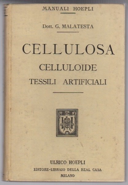 VII, [1], 176, 64 p., 16 cm, tela. Condizioni : USATO - Stato : Buono, ordinari segni d'uso e del tempo. Altre note : La cellulosa, eteri della cellulosa, costituzione, preparazione, il celluloide, impiego della cellulosa nella fabbricazione dei tessili artificiali, stato commerciale ed analisi delle sete artificiali.