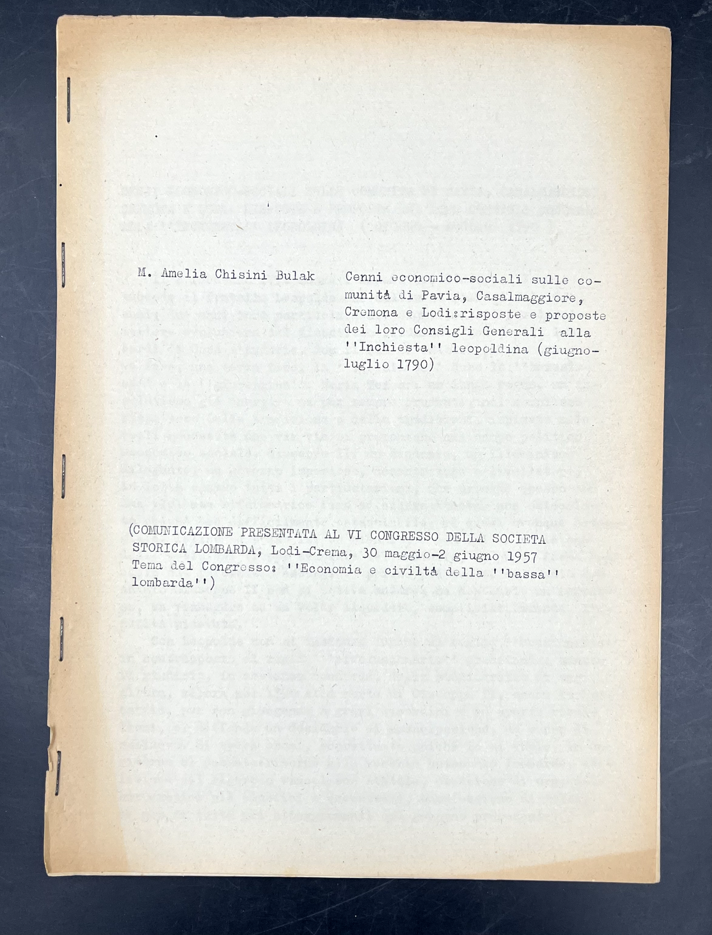 Comunicazione presentata al VI Congresso della Società Storica Lombarda, Lodi-Crema, 30 maggio-2 giugno 1957 su "Economia e civiltà dell 'bassa' lombarda". Fasc, pinzato di cm. 24,6x17,7, pp. 8 ciclostilate. Questa è la primissima edizione, distribuita ai membri del Congresso.