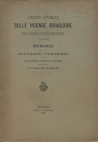 Cenni storici sulle vicende idrauliche della bassa pianura bolognese. Memorie del Cav. Ing. Giovanni Veronesi lette alla Società Agraria di Bologna nelle tornate 10 e 24 Gennaio 1858 e 30 Gennaio 1887.
